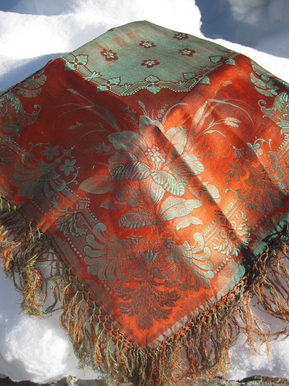 Il était majoritairement en soie tissée de couleur chatoyante, acheté auprès du colporteur venant de Lyon ou de Turin. On pouvait également trouver des châles en fin lainage, de couleurs diverses, brodés de fleurs sur la pointe du dos, par les femmes elles-mêmes. L'un et l'autre étaient décorés de franges en fils de soie.