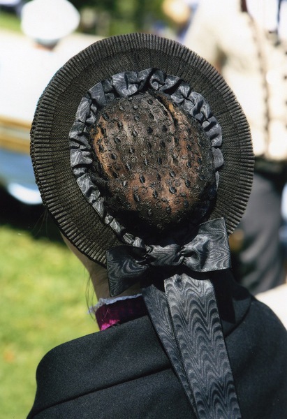 Le dos de la jupe est monté en petit plis très serrées lui donnant une grande ampleur. Au bas sont cousus deux ou trois rubans de velours noir. Une "balayeuse" (petit ruban poilu) se trouve au bas de la robe pour éviter qu'elle ne soit élimée trop rapidement.