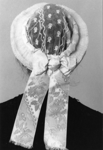 Le fond de la coiffe est fermé par un tulle de même couleur, non amidonné, brodé de fins motifs souvent floraux. Sur la nuque, un noeud en ruban de soie moirée ou broché ferme la coiffe. Les deux pents de 25 à 30 cm tombent dans le dos et flottent au vent pendant nos danses.